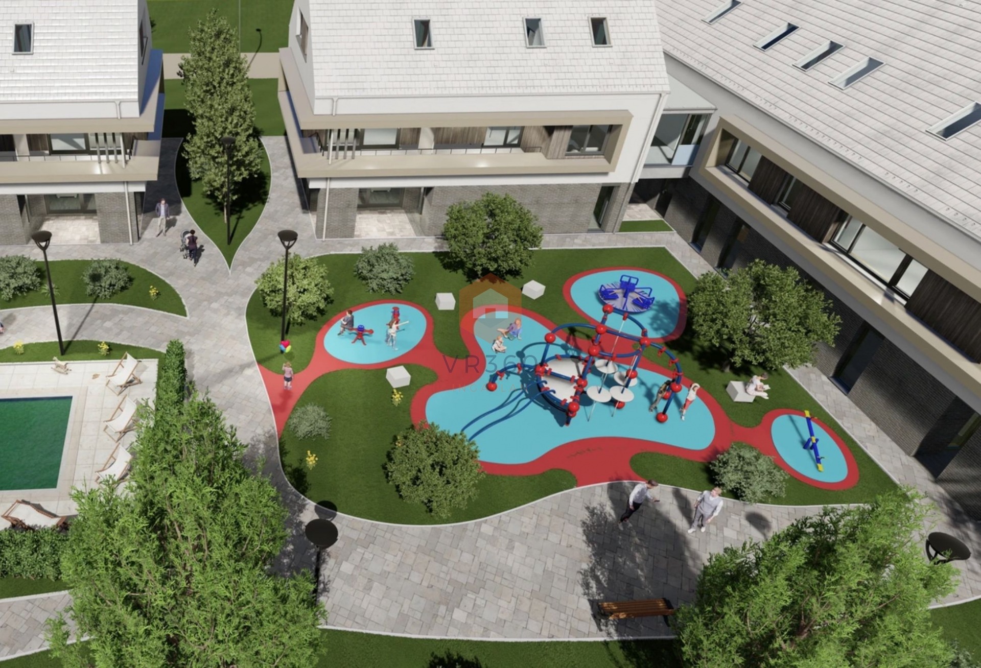 A lakóparkban 2 L alakú épület található, mindkét épületben 8 lakás.